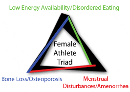 Syndromet The female athlete triad definieras som ätstörningar med viktminskning, utebliven eller oregelbunden menstruation och benskörhet. Riskfaktorerna för ”the female athlete triad” är elitidrottande i en gren som kräver att man ofta kollar sin vikt, att man idrottar mer än vad som krävs, ägnar så mycket tid åt idrotten att man inte har tid att träffa vänner och att man pressas av sin coach eller sina föräldrar att vinna till varje pris. Idrottande tonårsflickor är en vanlig patientgrupp på gynekologmottagningar (Prevention av ätstörningar 2004, Statens folkhälsoinstitut).